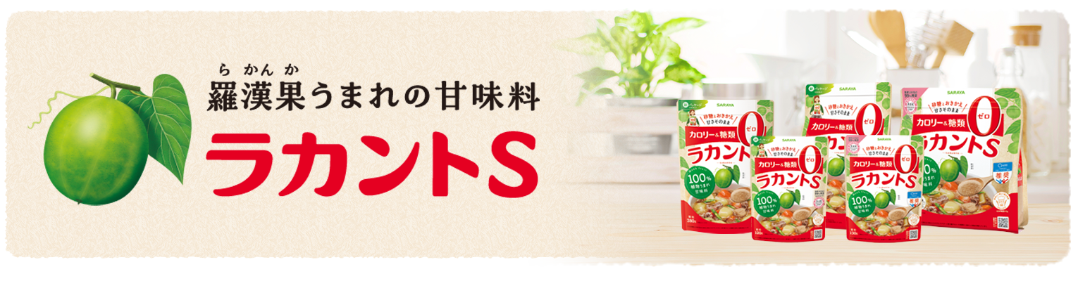 「ラカントS」は、古くから健康に役立つ原料として親しまれてきたウリ科の植物「羅漢果(ラカンカ)」の高純度エキスと、トウモロコシなどの発酵から得られる甘味成分「エリスリトール」から作られた、カロリー&糖類ゼロの植物うまれ甘味料です。砂糖と同じ甘さで使いやすく、加熱しても甘味が変わらないので、煮物をはじめ幅広いメニューにお使いいただけます。